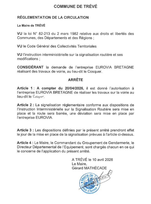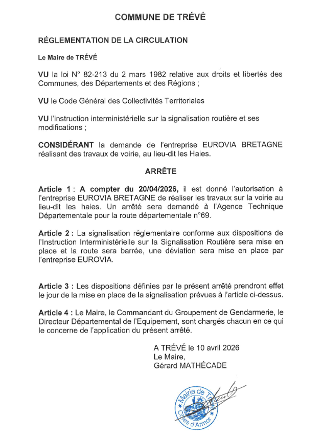 Arrêté travaux Trévé – SADER