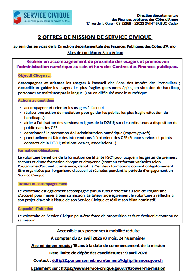La Direction Départementale des Finances des Côtes d’Armor recherche deux personnes service civique pour le poste d’accueil de LOUDEAC et ST BRIEUC (impôt).